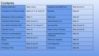 The document provides details for two proposed magazines, including witness statements, corrections to photoshop work, a survey breakdown, production plans, calendar events, financial projections, location plans, proposals, photoshoot plans, and equipment costs. Sections cover the four week production process, proposed issue dates and audiences, cost analyses, risk assessments, sample front covers and spreads, and requirements for photoshoots.