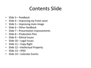 This document provides an overview of the contents of a presentation. It summarizes feedback received and improvements made to the presentation, including adding a production plan slide, improving the front cover design, and enhancing a main image. The document also discusses receiving additional feedback from the presenter's mother and making improvements to the presentation delivery, such as speaking louder and using more hand gestures. Finally, it outlines several legal and ethical issues related to publishing a magazine.