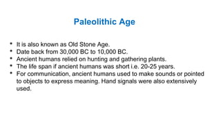 The Paleolithic Age, also known as the Old Stone Age, lasted from around 30,000 BC to 10,000 BC. Early humans during this time relied on hunting and gathering plants for survival. They lived short lives of 20-25 years on average and communicated through sounds, gestures, and signals. Early humans resided in huts, caves, or tepees and used stone tools for hunting as well as animal skins and jewelry. They believed in spirits and created cave paintings depicting animals.