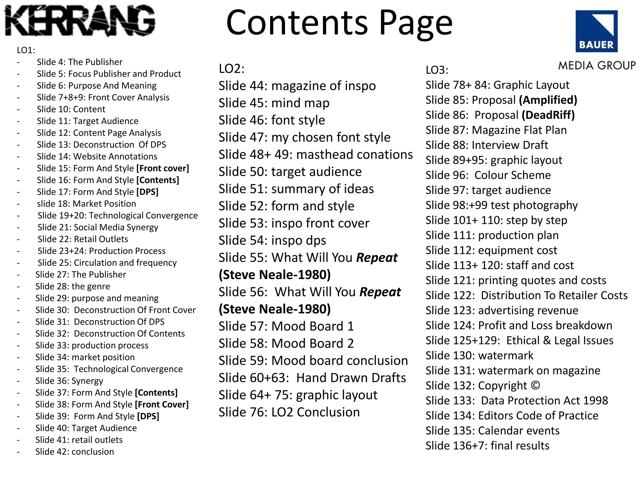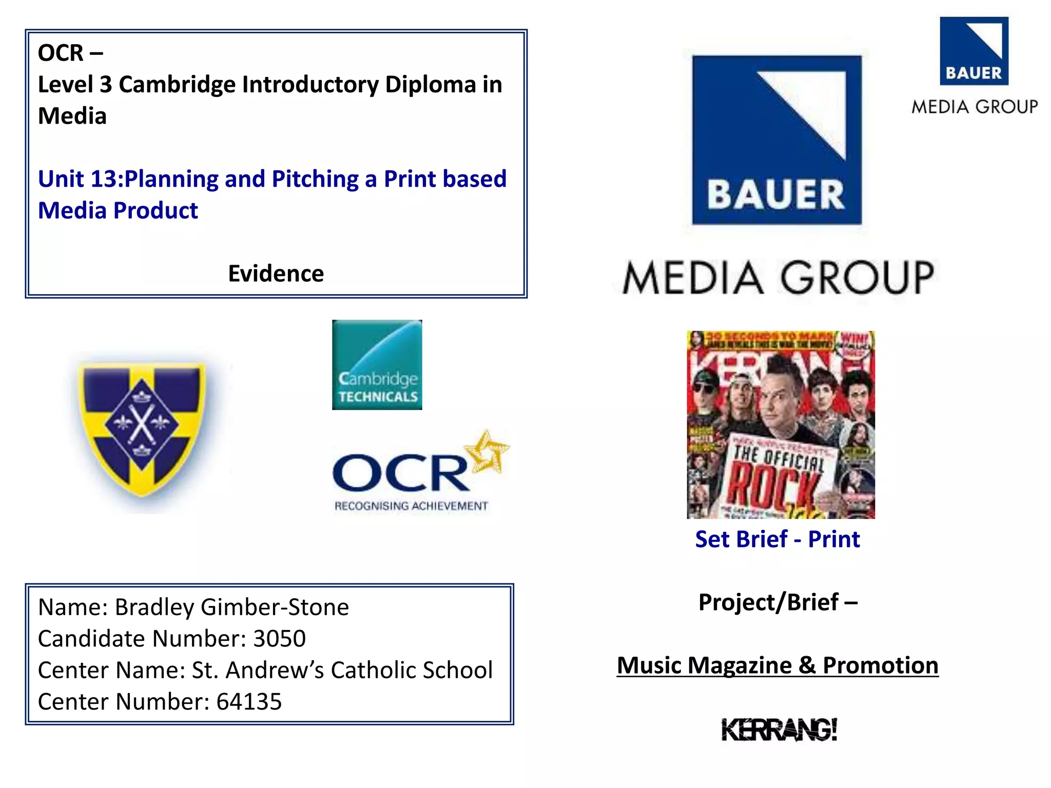 This document contains analysis of a print magazine called Kerrang! published by Bauer Media Group. It analyzes various elements of the magazine including the front cover, double page spreads, content, target audience, and more. The target audience is identified as males and females aged 14-25 from socio-economic class ABC1 who want to stay informed about new rock and metal music and bands. Elements like the masthead, images, and cover lines are examined for how they appeal to and attract this target demographic. Overall the document provides a thorough breakdown and evaluation of Kerrang! magazine's format, style, and approach.