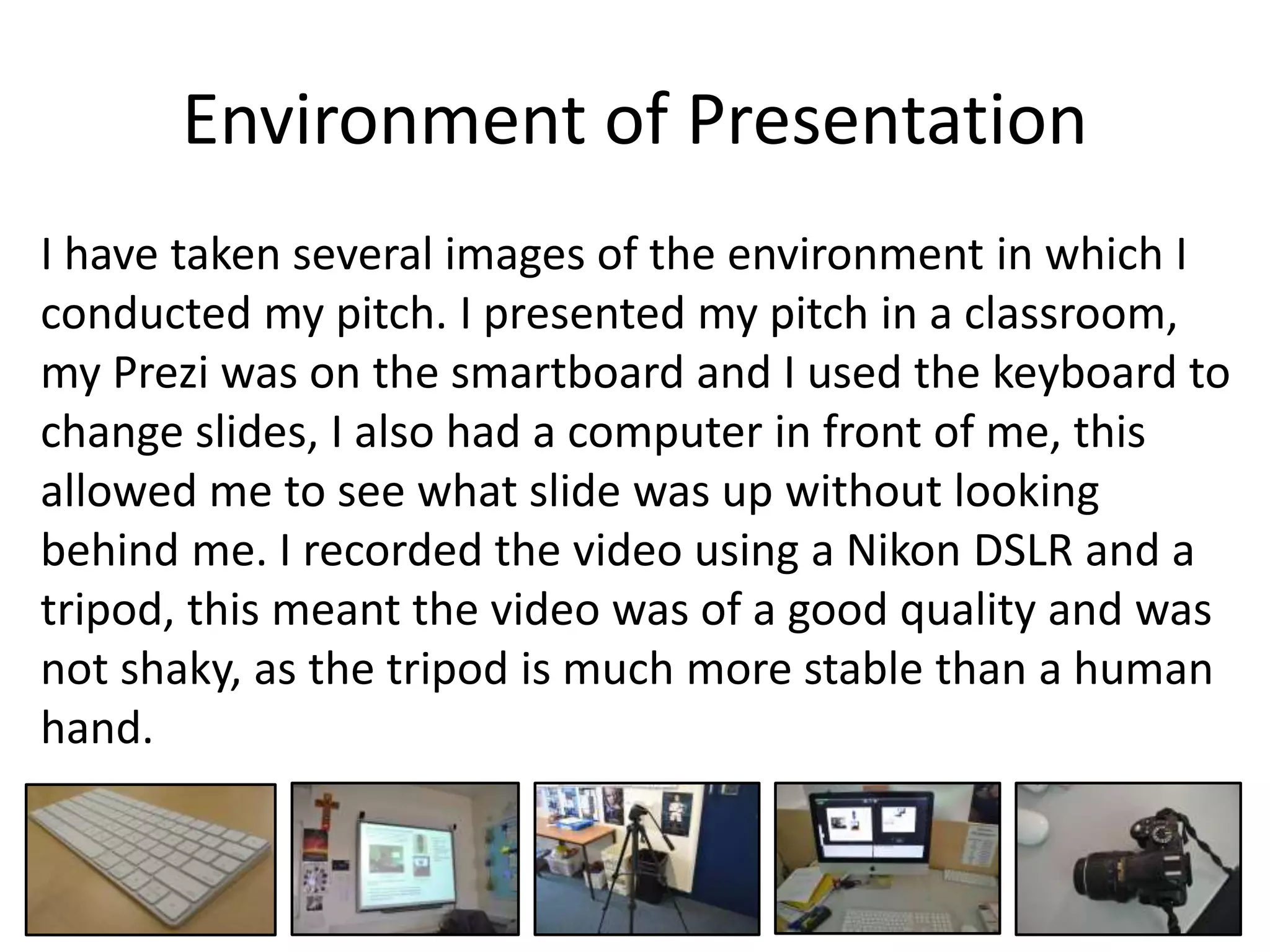 The document discusses the environment and materials used for a presentation pitch. It was presented in a classroom using a Prezi on a smartboard. A video was recorded using a DSLR camera on a tripod for high quality. Feedback was received from surveys and teachers to help improve strengths and weaknesses. PowerPoint was used to create presentation content which was then uploaded to Prezi. Research was also done online. Feedback highlighted needing to learn the script and adding more details. Improvements were made such as moving images based on the feedback.