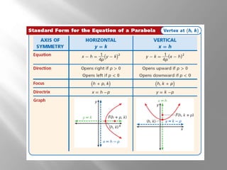 This document provides an overview of parabolas including their key characteristics and equations. It defines a parabola as the set of all points that are an equal distance from both a fixed point called the focus and a fixed line called the directrix. The standard equation of a parabola is provided and examples are given of writing the equation of a parabola given its focus and directrix. The document also discusses graphing parabolas by identifying the vertex, axis of symmetry, focus, and directrix. Real-world applications of parabolas to reflect light and sound are briefly described.
