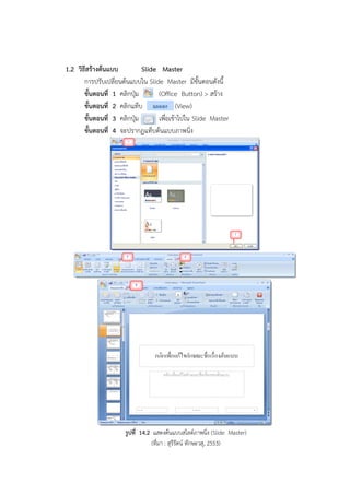สร้างต้นแบบของสไลด์ (Slide Master) การปรับแต่ง Slide Master ที่เป็นต้นแบบภาพนิ่งหรือที่เรียกว่า Template การปรับแต่ง Slide Master นี้จะช่วยให้เราสร้างรูปแบบและลักษณะที่เป็นต้นแบบของสไลด์ได้อย่างง่ายๆ 1.1 Slide Master คืออะไร Slide Master คือ ส่วนหนึ่งของต้นแบบภาพนิ่ง (Template) มีหน้าที่เก็บข้อมูล มาตรฐานของโปรแกรม PowerPoint 2007 เช่น ขนาดและชนิดของตัวอักษร, รูปแบบของหัวข้อ ย่อย, ตาแหน่งและกรอบของออบเจ๊กต์ต่างๆ รวมไปถึงรูปแบบพื้นหลังและสีบนสไลด์ เราสามารถ แก้ไขข้อมูลมาตรฐานของแบบภาพนิ่งได้ โดยผ่านทาง Slide Master รูปที่ 14.1 แสดงต้นแบบสไลด์ภาพนิ่ง (Slide Master) (ที่มา : สุรีรัตน์ ทักษะวสุ, 2553)