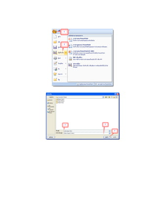 แล้ว เรายังสามารถสร้างต้นแบบของ มุมมองอื่นๆ ได้อีกด้วย ได้แก่ มุมมอง Handout สาหรับพิมพ์งานนาเสนอออกทางเครื่องพิมพ์ เพื่อใช้ประกอบในการบรรยาย และมุมมอง Notes สาหรับพิมพ์บันทึกย่อ ซึ่งในการสร้างจะมีวีการ เดียวกับการสร้างต้นแบบของสไลด์ โดยคลิกปุ่มมุมมองที่ส่วนของ Presentation Views ดังนี้ - คลิกเพื่อสร้างต้นแบบของมุมมอง Handout - คลิกเพื่อสร้างต้นแบบของมุมมอง Notes 2. สร้างรูปแบบสไลด์สาเร็จรูป (Themes) หลังจากที่ได้สร้างต้นแบบของสไลด์แล้ว จะเห็นได้ว่าต้นแบบของสไลด์ที่ได้สร้างขึ้นมานั้นจะ เก็บอยู่ที่ไฟล์นาเสนอที่สร้างไว้เพียงไฟล์เดียว หากเราต้องการนารูปแบบที่ได้กาหนดให้กับต้นแบบ ของสไลด์ไปใช้กับงานนาเสนออื่นๆ เราจะต้องสร้างเป็นธีม (Theme) ก่อน เพื่อเก็บไว้ใช้งานในครั้ง ต่อไป โดยจะต้องสร้างเป็นต้นแบบของสไลด์ก่อนและเข้าสู่การบันทึกเพื่อสร้างธีม มีขั้นตอนดังนี้ ขั้นตอนที่ 1 คลิกปุ่ม (Office Button) > เลือกคาสั่ง Save As (หลังจากสร้าง ต้นแบบของสไลด์แล้ว) ขั้นตอนที่ 2 กาหนดชื่อของธีมที่ช่อง ขั้นตอนที่ 3 กาหนดชนิดการบันทึกเป็น ขั้นตอนที่ 4 คลิกปุ่ม จากนั้นธีมนี้จะถูกเก็บไว้ในเครื่อง ซึ่งเราสามารถใช้งาน จากไฟล์อื่นๆ ได้ ขั้นตอนที่ 5 หลังจากที่บันทึกเป็นรูปแบบสไลด์สาเร็จรูปเรียบร้อยแล้ว จะถูกจัดเก็บไว้ที่ ชุดของธีม ซึ่งเราสามารถเรียกใช้งานได้ที่แท็บ