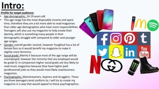 - The document profiles the target audience for a proposed music magazine as 14-19 year olds, with a slightly more feminine slant.