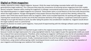 - Initially, the creator planned a digital magazine but switched to print due to issues with interactive elements and the importance of posters for identity construction among teens.
