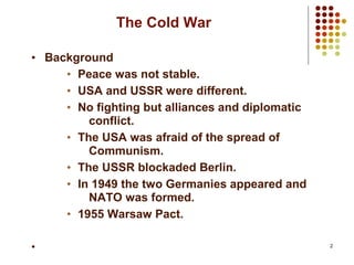 The Cold War was a period of geopolitical tension between the United States and Soviet Union from the mid-1940s until the early 1990s. During this time, there was no direct military conflict between the two superpowers, but they supported major regional conflicts like the Korean War and the Vietnam War by proxy. Tensions escalated further in events like the Berlin Blockade and Cuban Missile Crisis, and the Cold War only ended in the late 1980s as reformist leader Gorbachev rose to power in the USSR and liberalized communist rule in Eastern Europe.