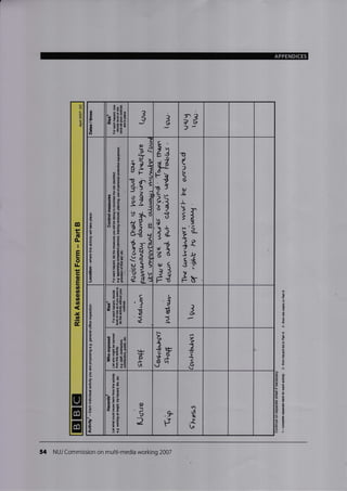 This document contains a BBC risk assessment form with several sections. It lists the location of the risk assessment as Hampstead Heath and outlines that the assessment covers a radio production involving an outdoor location shoot. It lists the team members involved and identifies several potential hazards from the provided list like assault, working at heights, slipping/tripping hazards. The final section rates the likelihood and severity of potential harms to determine the overall risk level.