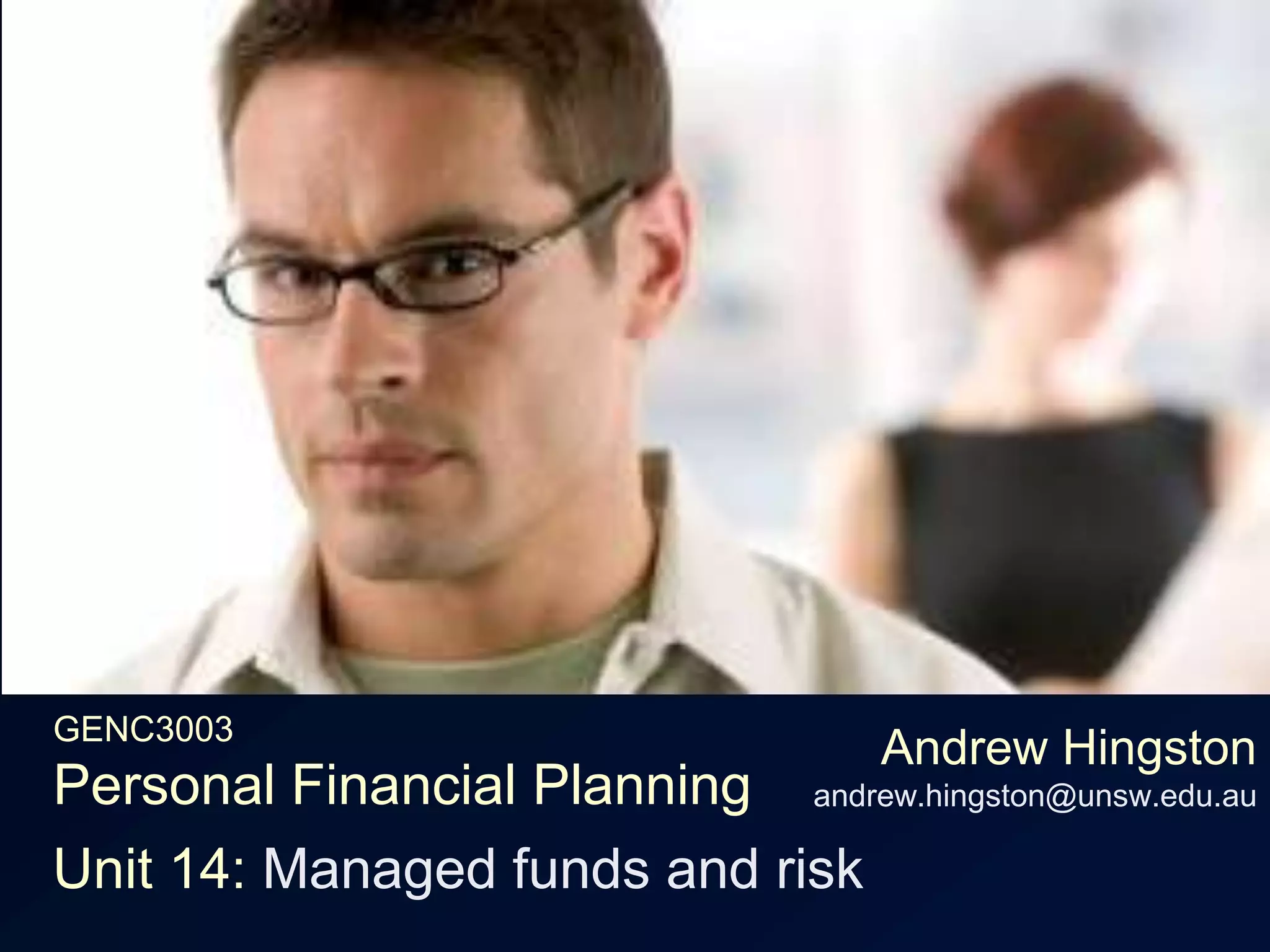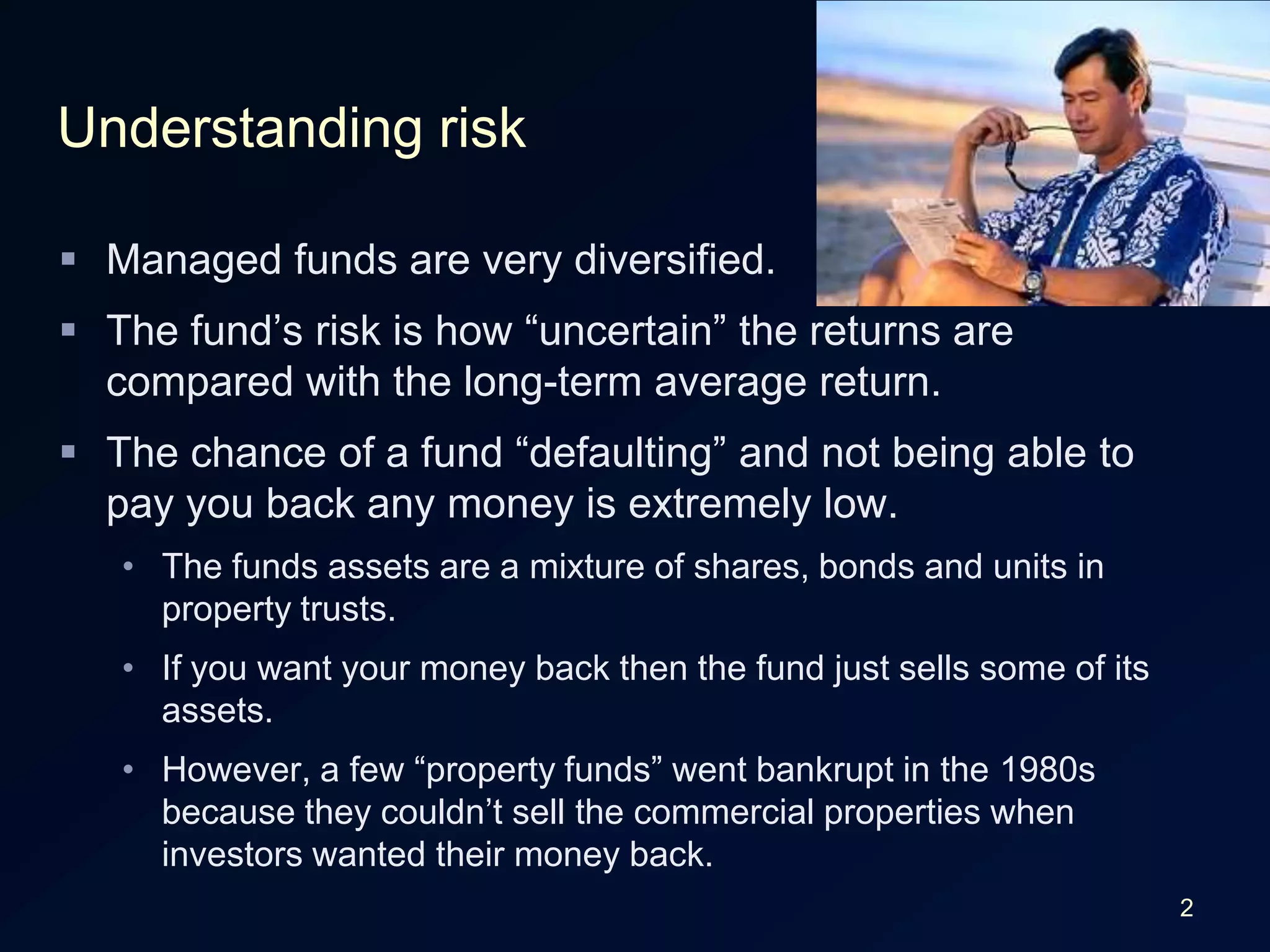 The document discusses managed funds and risk. It states that while AMP went through financial difficulties in 2003, managed funds are diversified so the risk of default is extremely low. It also explains that a fund sells assets to pay investors rather than defaulting, though some property funds bankrupt in the 1980s when they couldn't sell properties. It then asks the reader to arrange investments on a risk scale from lower average returns but less uncertainty of returns to higher average returns but more uncertainty of returns. Finally, it asks which portfolio would be most appropriate for a graduate willing to accept moderate risk and not touch funds for 7 years.