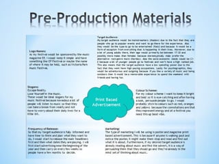 The document analyzes print and audiovisual advertising for the Reading and Leeds music festivals. It discusses the festivals' history and aims to raise awareness and increase sales by announcing popular artists. Print ads start in February and are placed in music magazines and radio to promote the festivals. The target audience is primarily 16-25 year old males, but also some older attendees. Representation in ads may stereotypically feature young, white people interested in alternative rock. The festivals' partnerships provide broadcasting and products. Their message is enjoying music over summer and stress relief. Colorful print ads with bold artist names attract attention to the lineup.