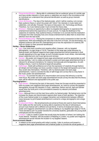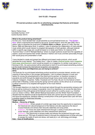 - Two print advertisements will be created - a festival poster and a magazine back page ad. Both will advertise the festival's music genres, popular artists, and annual theme.