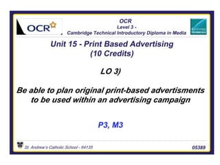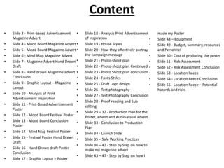 The document outlines the content of a presentation on print-based advertisements for a music festival. It includes mood boards, mind maps, and draft designs for a magazine advertisement and poster. For the magazine advert, hand-drawn drafts show a purple banner, artist names, date, and website/phone number. For the poster, hand-drawn drafts feature a colorful background, palm trees, dates, a large flowing header, slogan, and shadow of a crowd to convey the summer feel and nighttime music. Both designs aim to attract 18-25 year old students and promote the festival's dates, location, and cost.
