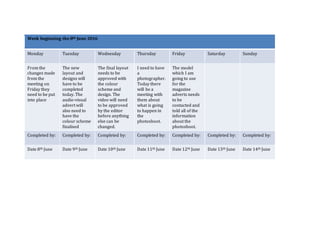 The document outlines the schedule and tasks for an advertising campaign over 3 weeks in June. It includes planning meetings, designing logos, layouts and storyboards, hiring photographers, scheduling photoshoots, editing photos, designing magazine and video ads, recording music, setting budgets, approvals from editors, and launching the final materials. The tasks are documented by date with notes on the activities and milestones to be completed each day.