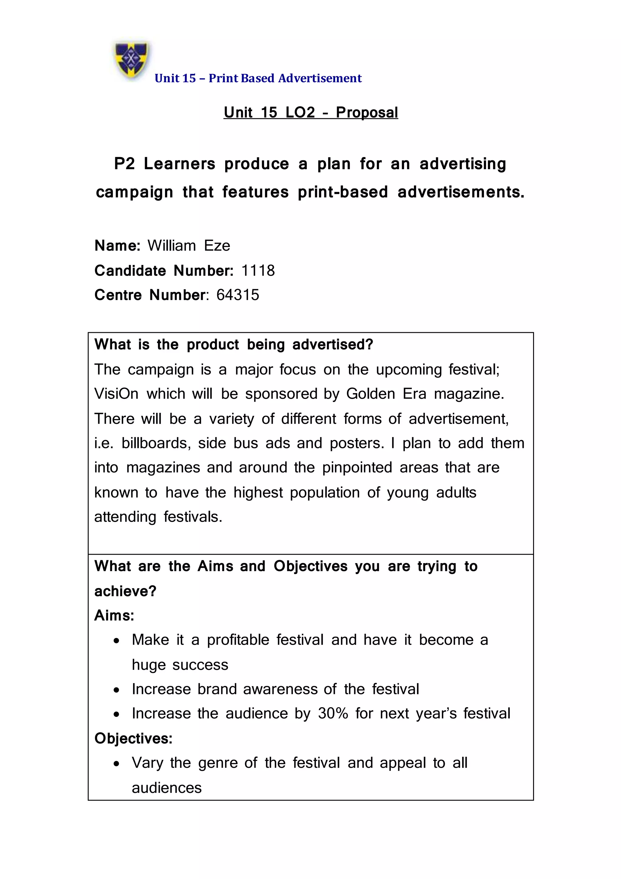 The campaign is for an upcoming music festival called VisiOn, which will be sponsored by Golden Era magazine. The aims are to make the festival profitable and a huge success, increase the brand awareness of the festival, and increase attendance by 30% the following year. The target audience is males aged 16-24 from classes C1-E who seek adventure and would document their experience on social media. The campaign message will include the festival dates, performing artists, and sponsors. The slogan is "VisiOn it and listen to that VisiOn". The advertisements will feature the festival date, sponsors, headlining artists, festival name, and location.