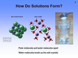 2. Solubility is affected by temperature - more solute can dissolve in hot solvents than cool solvents. At saturation, cooling a solution can cause crystals to precipitate out.