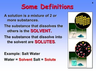1. A solution is a mixture of two or more substances, where the substance that dissolves the others is the solvent and the substances that dissolve are solutes. For example, in salt water the solvent is water and the solute is salt.