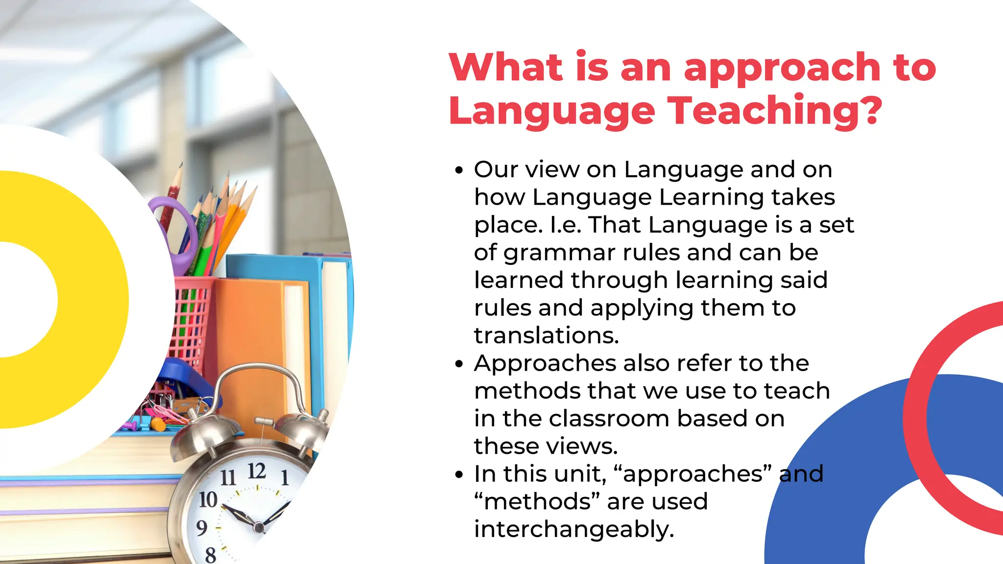 The document outlines various approaches to language teaching, defining 'approaches' and 'methods' interchangeably, while emphasizing the significance of grammar rules, vocabulary, and communicative practices. It describes several specific teaching methods including Presentation, Practice, and Production (PPP), Total Physical Response (TPR), the Lexical Approach, and the Communicative Approach, each with distinct views on language and techniques for classroom practice. The document highlights the importance of adapting teaching strategies to enhance language acquisition through meaningful interactions and contextual learning.