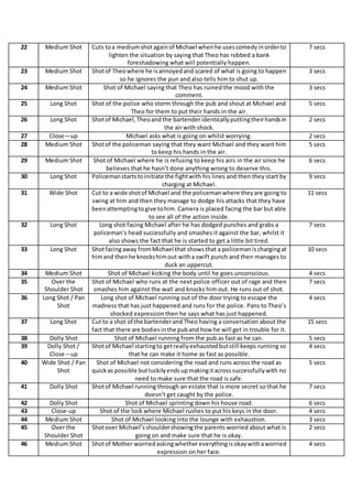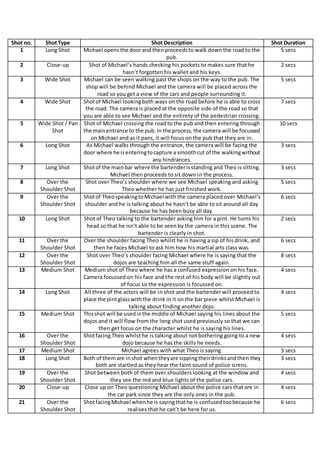 1. The document provides descriptions for 51 different shots that would be used to film a scene involving two friends, Michael and Theo, meeting at a pub. It then describes shots that would show Michael getting into a fight with police officers at the pub and fleeing to his home.