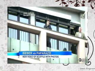 The document discusses a magazine article on media topics. It talks about a video featuring Justin Bieber and paparazzi. Students are given activities to complete, including dictation, summarizing a news article using subordinate clauses, and creating gossip news about a friend using the subordinate conjunction "although". Vocabulary words like "stress", "throw", and "promote" are also introduced.