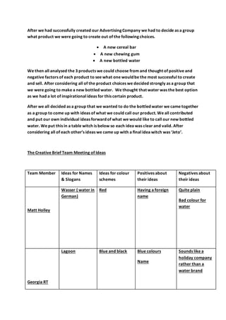 The student and their group created an advertising agency called "Hydra Advertising" to market a new product. They chose to create a bottled water called "Jeto" targeted at sports enthusiasts. They developed branding elements including a logo and slogan ("Release your inner champion"). They also created print and television advertisements to promote Jeto, filming a TV ad showcasing various sports. Finally, they pitched their new product to the class, receiving positive feedback. While the project was largely successful, the group noted minor errors in their TV ad filming they hoped to improve on.
