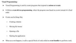Visual programming is a method of creating software applications using graphical elements rather than writing code in textual form. In visual programming, developers can drag and drop components, connect them using visual representations of logic, and design applications in a more intuitive way. This approach emphasizes what the program should do rather than focusing on the syntax of programming languages.