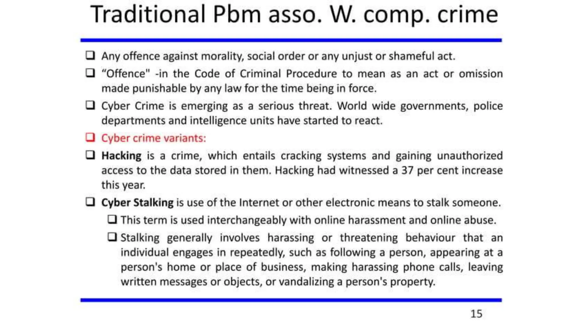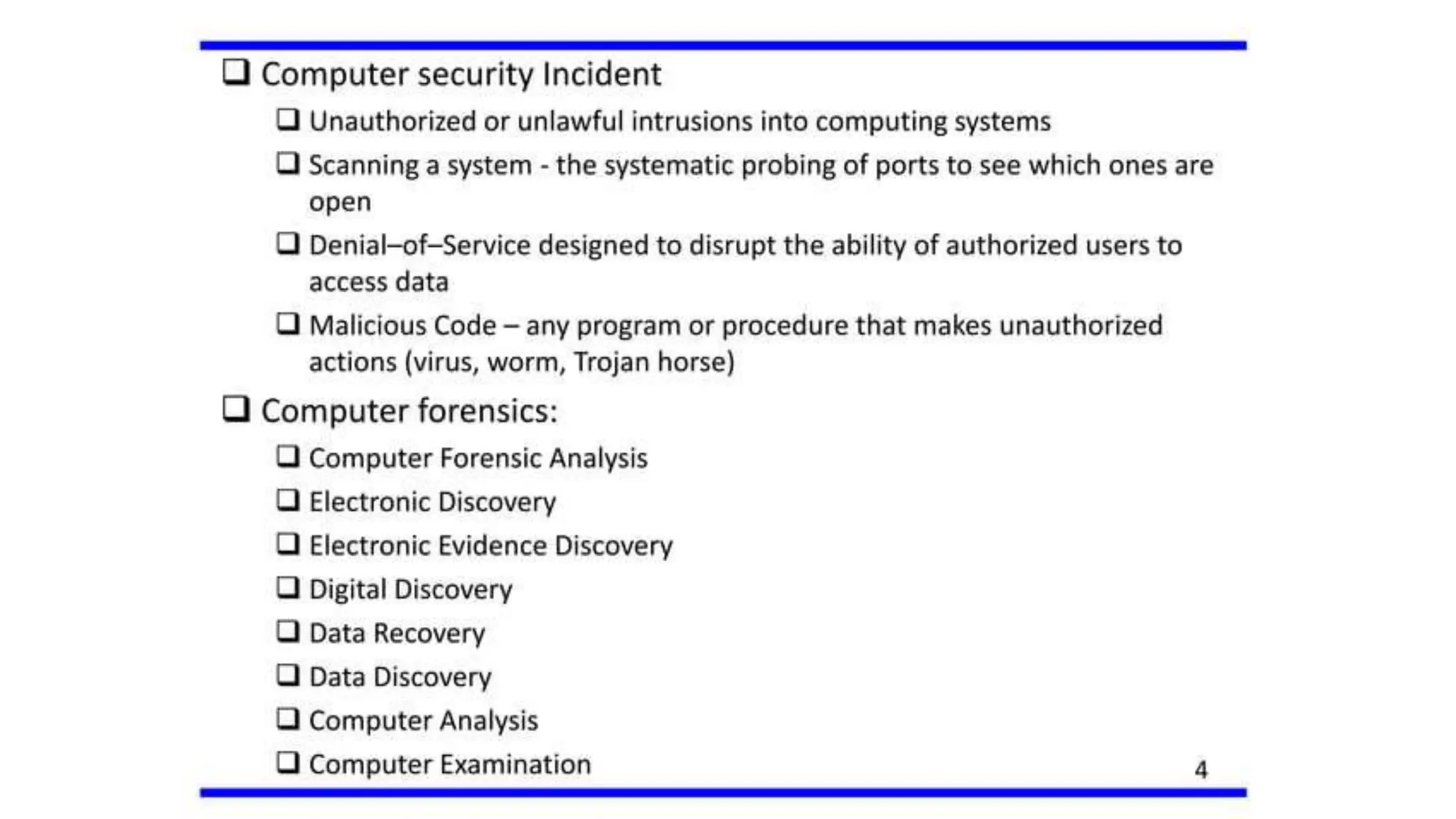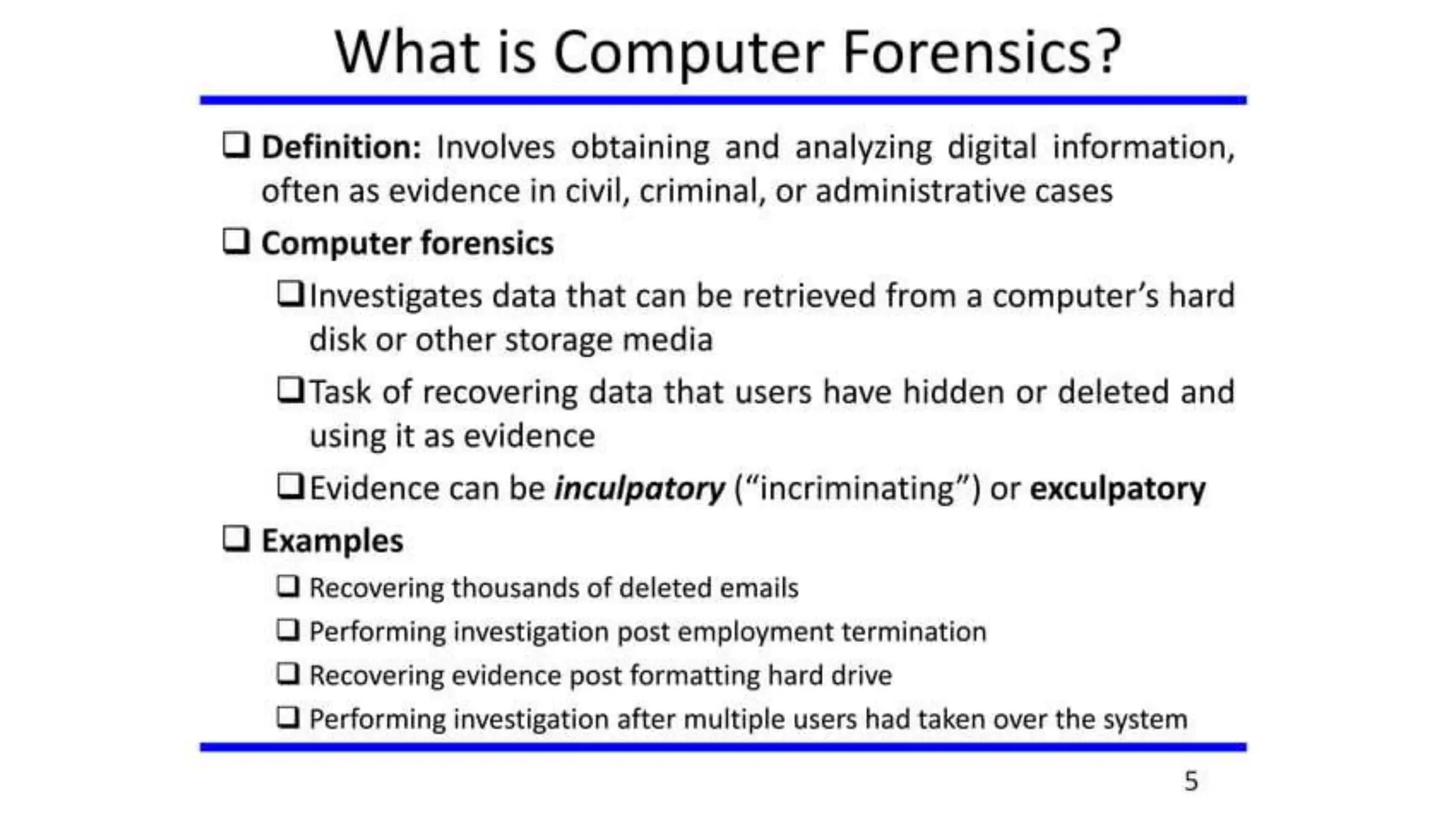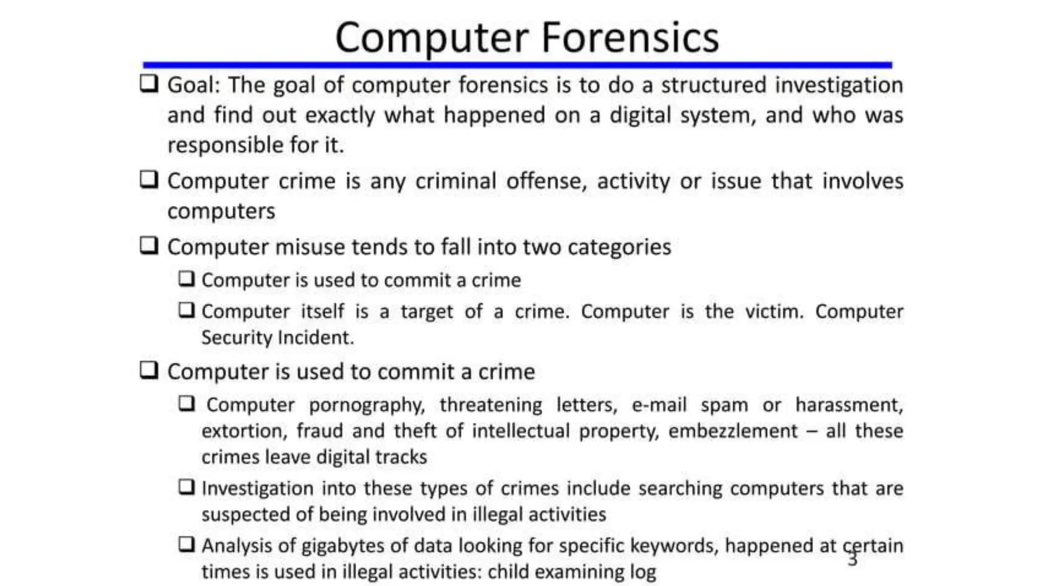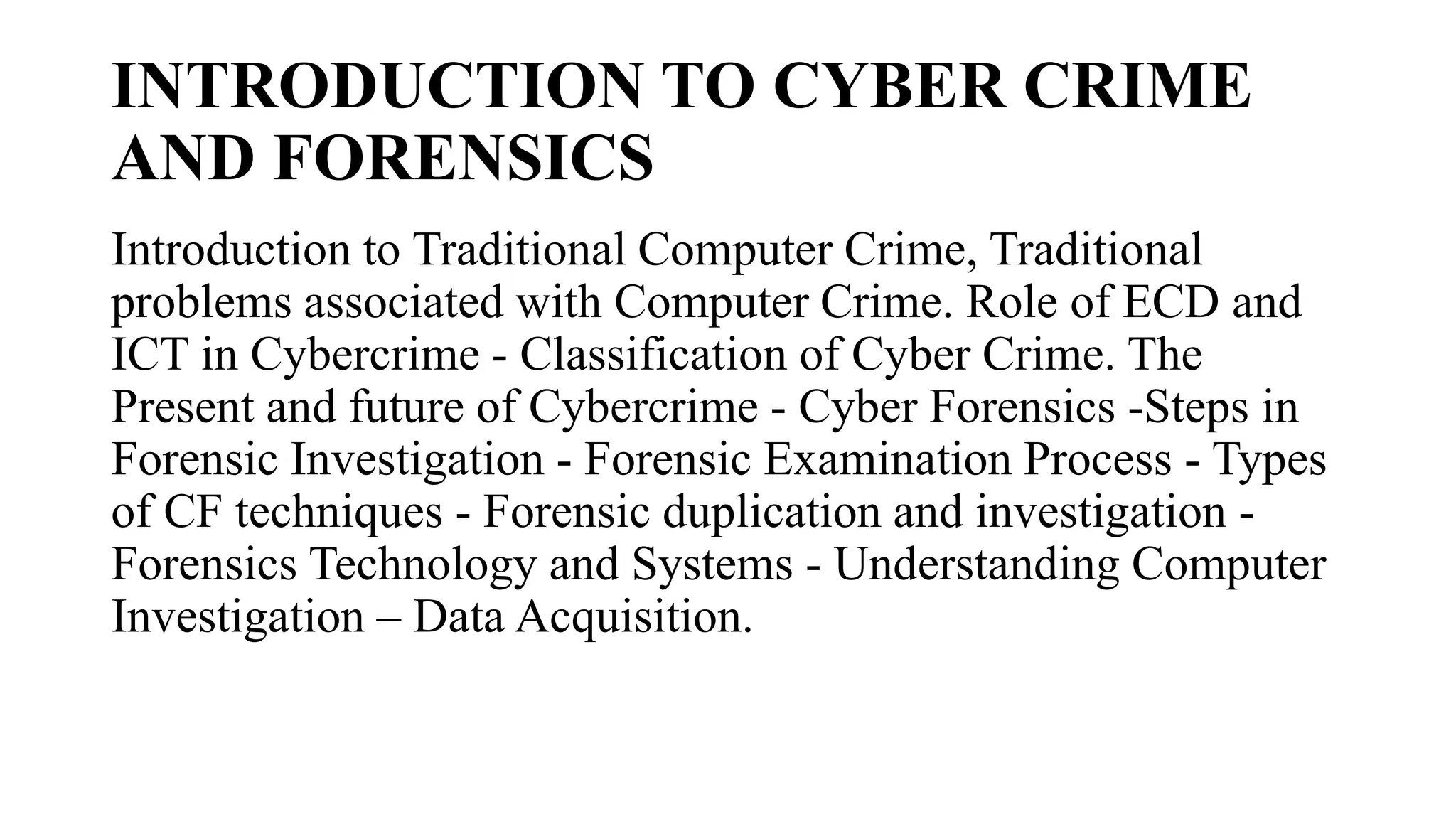 The document provides a comprehensive overview of cyber forensics, detailing its purpose, processes, and various types, such as network and mobile forensics. It also discusses the relationship between cybersecurity and cybercrime, classification of cyber crime, traditional computer crime challenges, and the steps involved in forensic investigations. Key concepts include data recovery methods, digital evidence handling, and the importance of maintaining evidence integrity for legal proceedings.