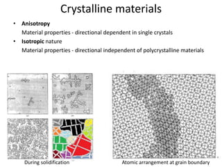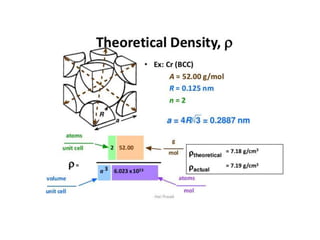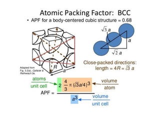 The document discusses the two principal forms of solids: crystalline and non-crystalline (amorphous) materials, detailing their structural differences, properties, and examples. It explains concepts such as space lattice, unit cells, and various crystal structures including body-centered cubic (bcc), face-centered cubic (fcc), and hexagonal close-packed (hcp). Additionally, it covers atomic packing factors and theoretical density calculations based on crystal structures.