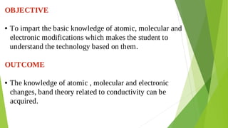 2. Key concepts covered include how molecular orbitals are formed from the overlap and combination of atomic orbitals, bonding and anti-bonding molecular orbitals, and how molecular orbital diagrams can be used to explain bonding properties.