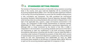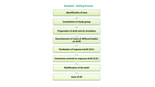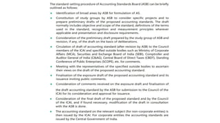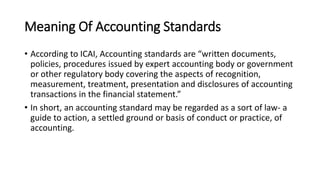 Accounting standards provide guidance on the recognition, measurement, treatment, presentation and disclosures of accounting transactions in financial statements. They aim to bring uniformity and reduce alternatives in accounting practices. The key accounting standards setting bodies in India are the Institute of Chartered Accountants of India (ICAI), National Advisory Committee on Accounting Standards (NACAS) and the newly formed National Financial Reporting Authority (NFRA). ICAI recommends accounting standards to NACAS, which advises the government. NFRA will regulate accounting standards and oversight the auditing profession. The objectives of convergence with IFRS in India are to adopt globally accepted best practices and ensure compliance.