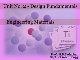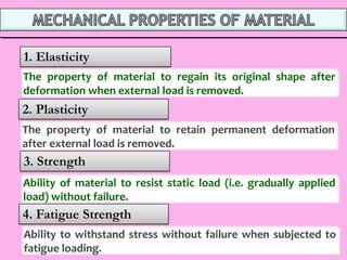 This document discusses various properties and types of engineering materials. It defines properties such as ductility, elasticity, toughness, hardness, creep, and resilience. It describes ferrous alloys which contain iron as the main element and lists examples. It also describes non-ferrous alloys which do not contain iron as the main element and provides examples. The document discusses composite materials which are made by combining two or more materials and retain their identities. It provides guidelines for selecting materials based on cost, availability, properties for the application, and suitability for manufacturing processes.