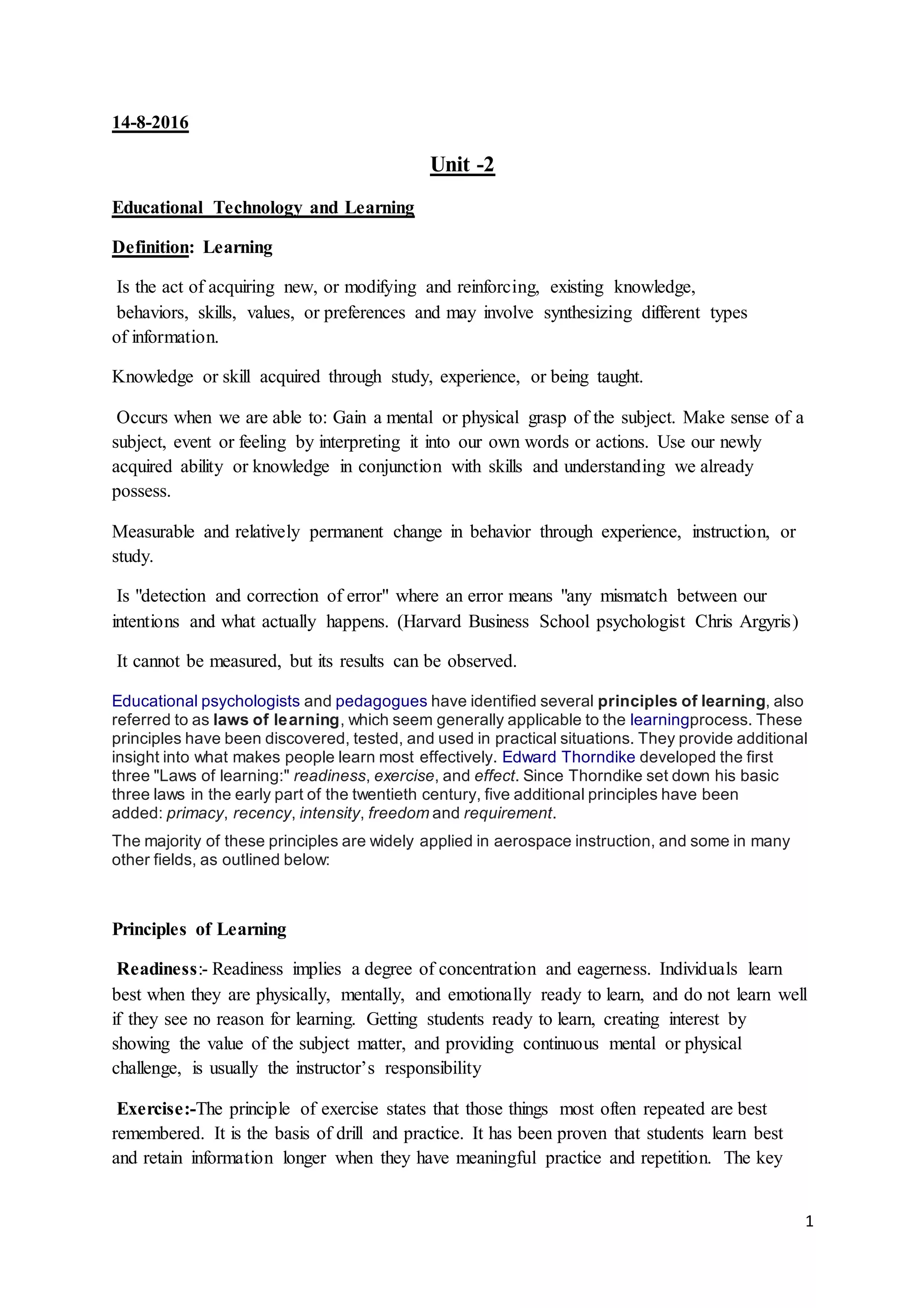 This document provides definitions and explanations of key concepts related to learning theories and principles. It discusses several major schools of learning theory, including behavioral theory, cognitive theory, social learning theory, social constructivism, multiple intelligences theory, and brain-based learning. For each theory, it outlines some of the core ideas and implications for how learners learn most effectively. It also describes principles of learning such as readiness, exercise, effect, primacy, recency, intensity, requirement, and freedom. Overall, the document aims to provide insight into learning from the perspective of educational psychology and different learning theories.