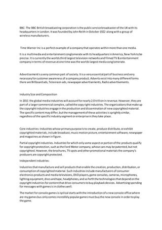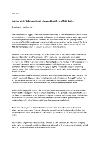 The document provides an overview of different sectors within the media industry, including their structures and job roles. It discusses the television sector as the largest and fastest growing, employing over 50,000 people in the UK. The radio sector is described as one of the oldest mass media forms that can be accessed virtually anywhere. The film industry is dominated by major companies and is very profitable. Other sectors covered include video games, animation, and publishing. Common characteristics across the different media sectors are that they are sensitive to technological changes, operate globally and locally, and create both information and entertainment.