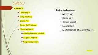 This document provides an overview of brute force and divide-and-conquer algorithms. It discusses various brute force algorithms like computing an, string matching, closest pair problem, convex hull problems, and exhaustive search algorithms like the traveling salesman problem and knapsack problem. It also analyzes the time efficiency of these brute force algorithms. The document then discusses the divide-and-conquer approach and provides examples like merge sort, quicksort, and matrix multiplication. It provides pseudocode and analysis for mergesort. In summary, the document covers brute force and divide-and-conquer techniques for solving algorithmic problems.