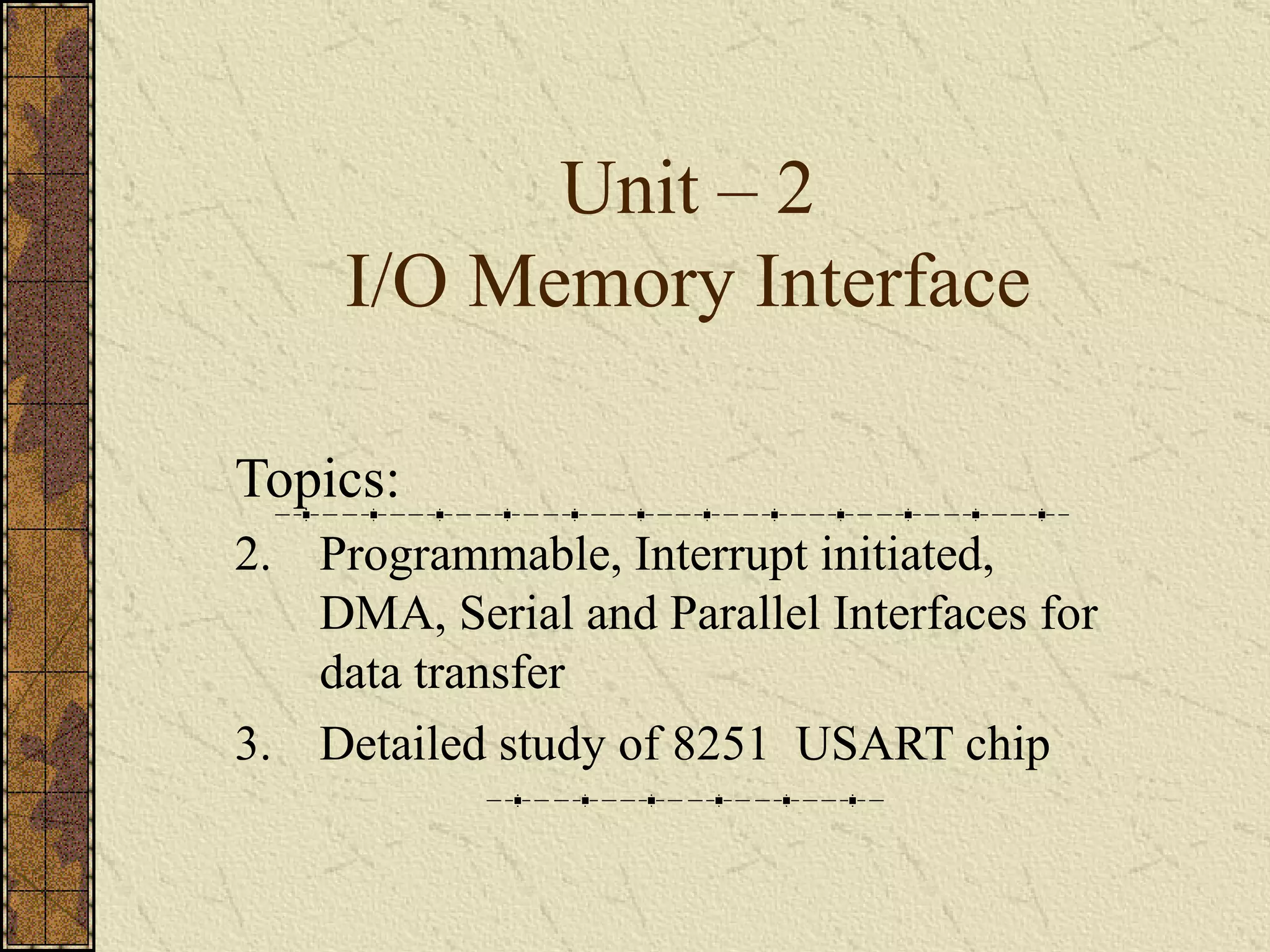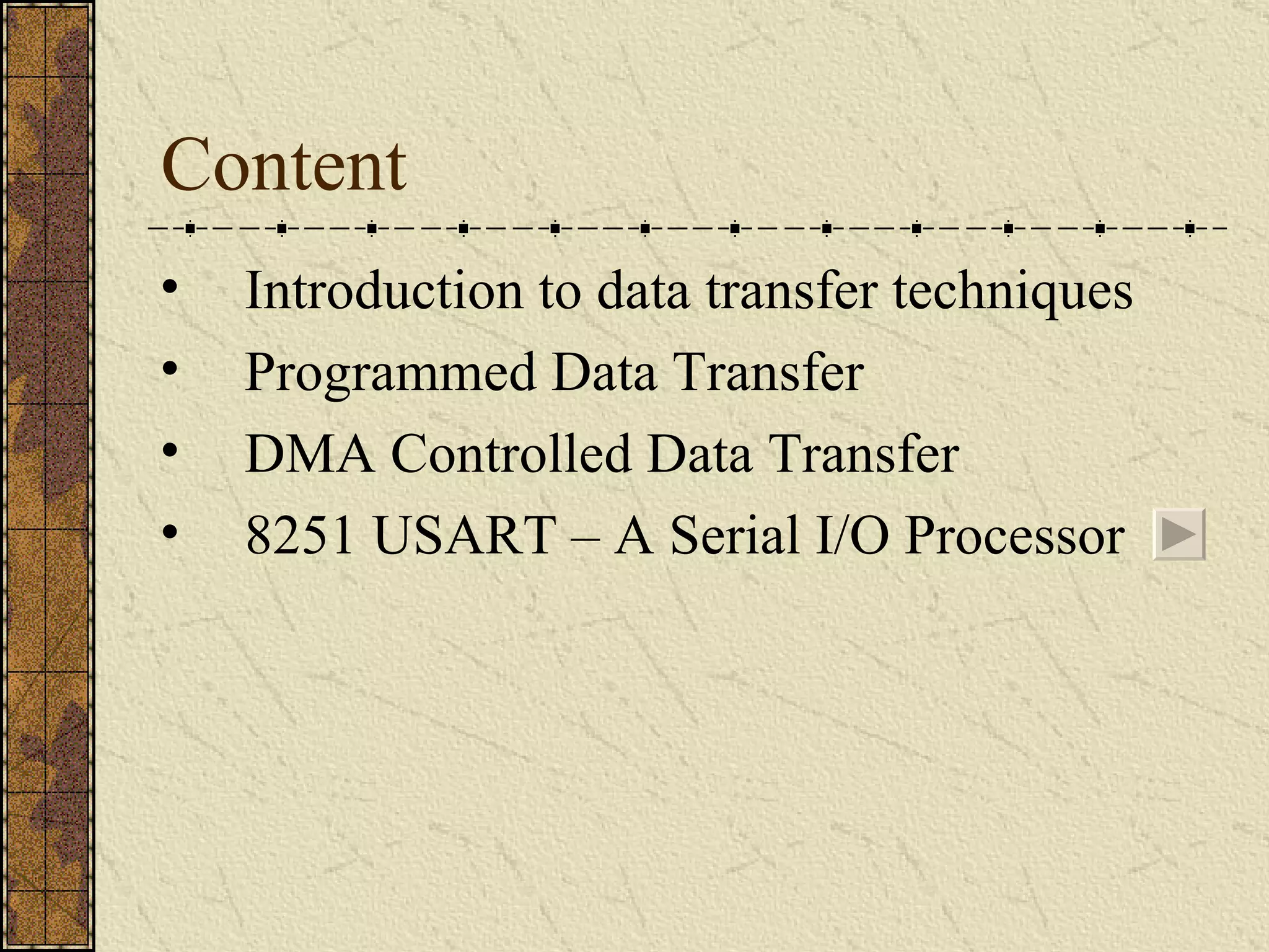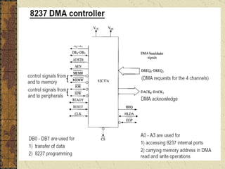 The document discusses various data transfer techniques in microprocessor systems, focusing on programmed, interrupt initiated, DMA, and serial and parallel interfaces. It details programmed data transfer methods, the functionality of direct memory access (DMA), and the role of the 8251 USART chip for serial communication in microprocessor systems. Key comparisons between data transfer types and the modes of operation for DMA and USART are also outlined.