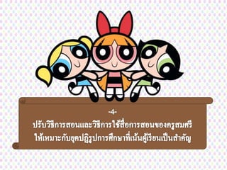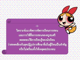 สื่อ และ สิ่งแวดล้อมต่างๆ โดยใช้กระบวนการต่างๆ เป็นเครื่องมือในการเรียนรู้และผู้เรียนมีโอกาส นาความรู้ไปประยุกต์ใช้ในสถานการณ์อื่น เนื่องจาก แปลว่า ครูสมศรีจัดระบบการสอน ของตนไม่สอดคล้องกับยุคปฏิรูป การศึกษาที่เน้นผู้เรียนเป็นสาคัญเพราะ ไม่ปลูกฝังให้เด็กลงมือปฏิบัติแก้ปัญหา หรือหาความรู้ให้ตัวเอง มีเพียงการสอน ให้ท่องจาเท่านั้น ซึ่งวิธีนี้นอกจากจะไม่ ทาให้นักเรียนคิดเองเป็นแล้ว ยังทาให้ ไม่มีปฏิสัมพันธ์กับบุคคลอื่นๆด้วย