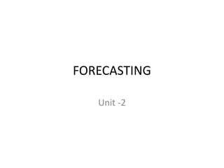 Forecasting is the process of estimating future events and problems based on an analysis of past and present data in order to help with planning. It plays a pivotal role in organizational success by aiding in development of effective business controls and implementation of coordinated planning projects. There are various types of forecasts including economic, technological, competition, and social forecasts. Common forecasting techniques involve quantitative time series analysis of past sales data to project future trends, derived forecasts that reuse data from other sources, and causal methods that use mathematical models to connect underlying causes to variables. Additional techniques are brainstorming sessions with experts and the Delphi method of gathering independent expert opinions over multiple rounds.