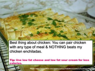 This document discusses the nutritional benefits of chicken. It notes that chicken is high in protein, which is important for hair and nail health. Chicken also contains niacin, a B vitamin that helps process fat. While chicken enchiladas and chicken paired with meals are favorites, peanuts also provide protein and niacin for those who don't like chicken.