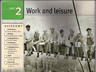 The document discusses what people want from work. It provides word partnerships describing high salary, long holidays, helpful colleagues, travel opportunities, and fast promotion. It then asks the reader to make a list of the most important things they want from work and compare lists with a partner.