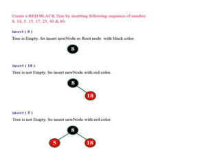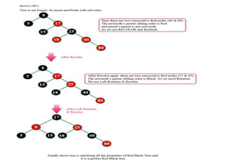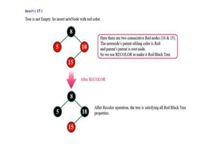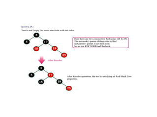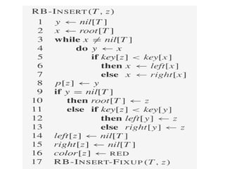 The document discusses red-black trees, which are a type of self-balancing binary search tree. Red-black trees ensure that no simple path from root to leaf is more than twice as long as any other path, keeping the tree balanced. Each node contains a color attribute (red or black) in addition to the standard key, left, right, and parent pointers. The document then describes the properties and algorithms for inserting and deleting nodes from red-black trees while maintaining the balancing properties.