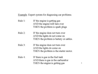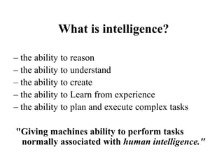 This document provides an introduction to artificial intelligence (AI) by discussing key concepts related to intelligence and different approaches to defining AI. It examines definitions of intelligence as the ability to reason, understand, learn from experience, and plan complex tasks. AI is defined as attempting to build intelligent computer systems that exhibit human-like intelligence. There are no widely agreed upon definitions of AI, but definitions generally fall into four categories: systems that think like humans, act like humans, think rationally, or act rationally. The document also discusses the Turing test, thinking rationally using logic, knowledge representation, and intelligent agents.