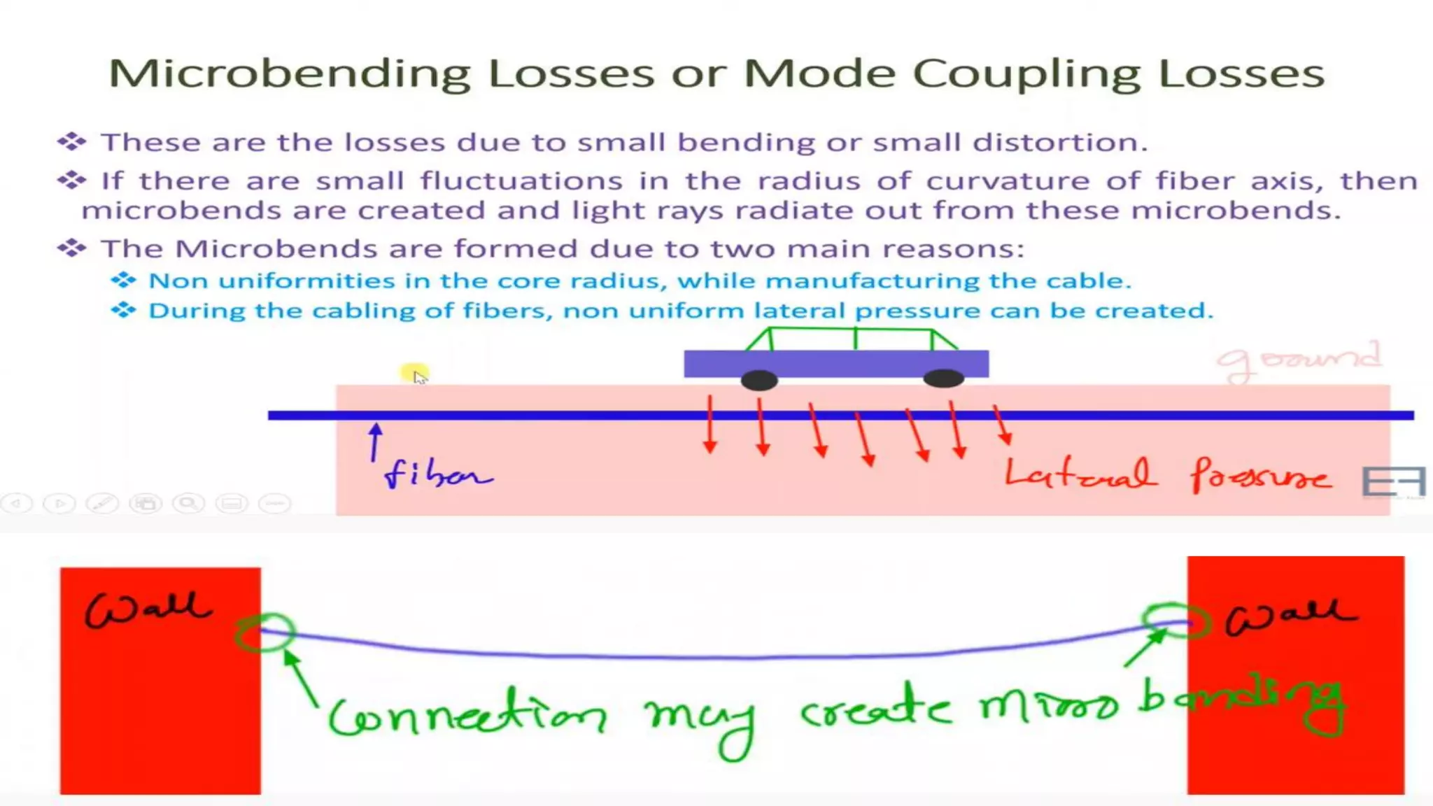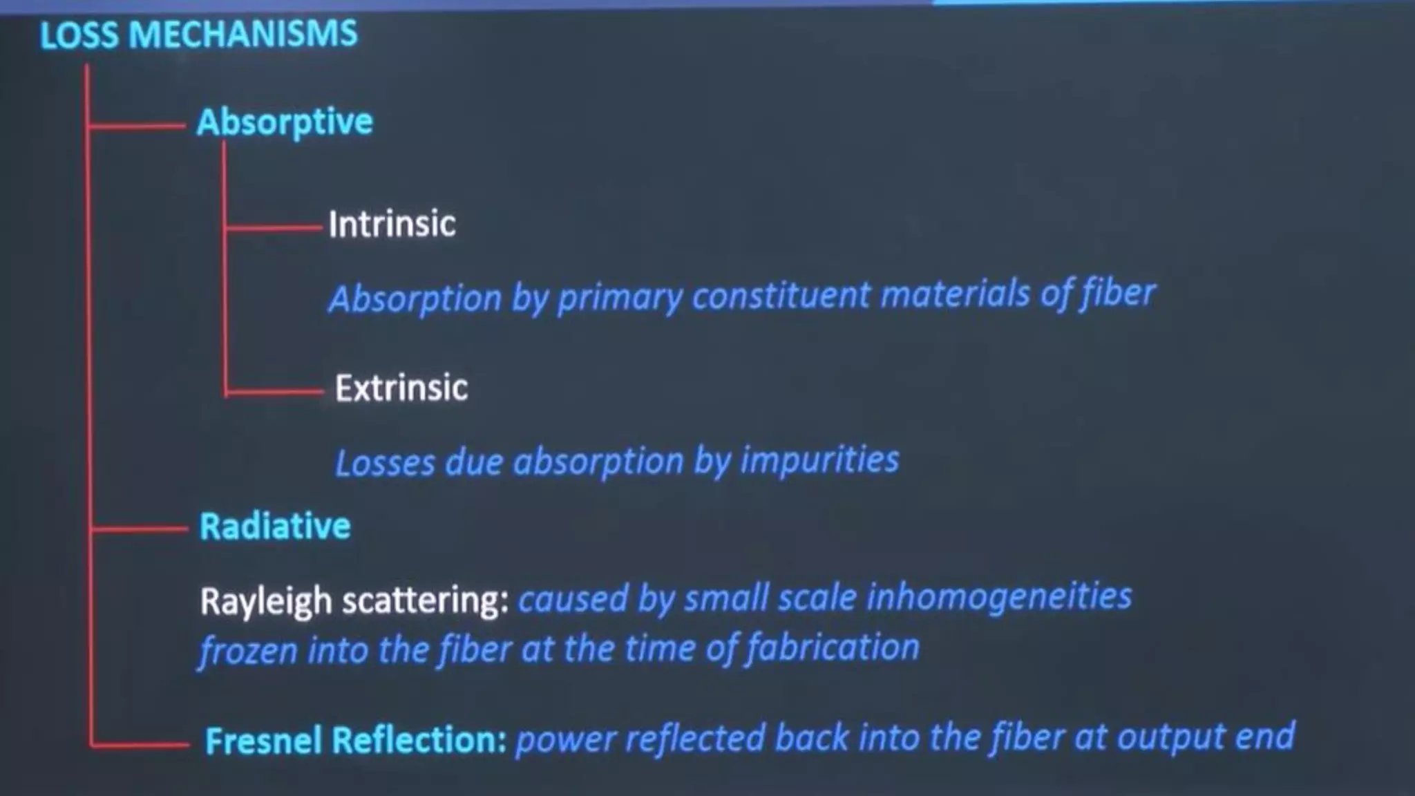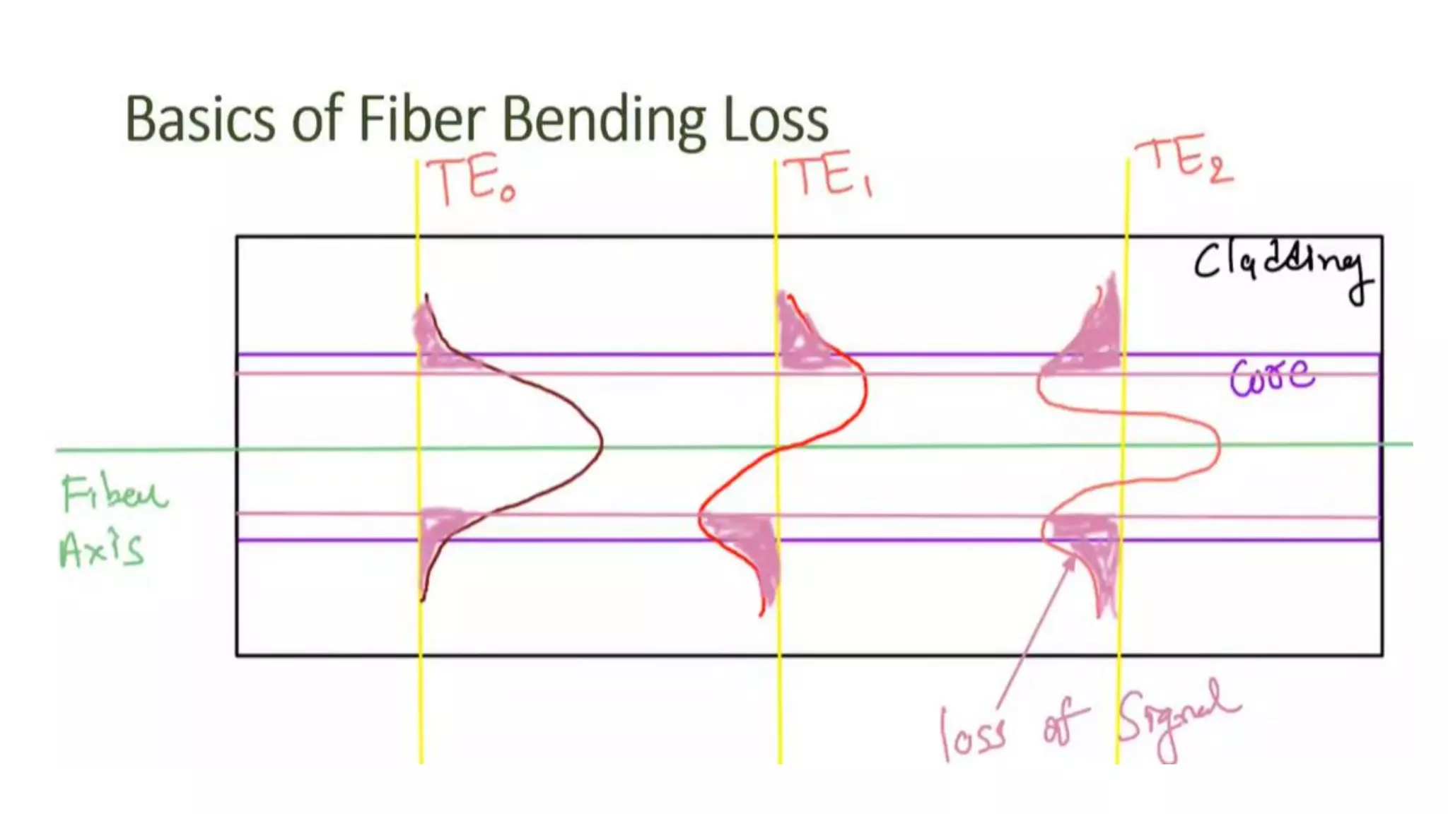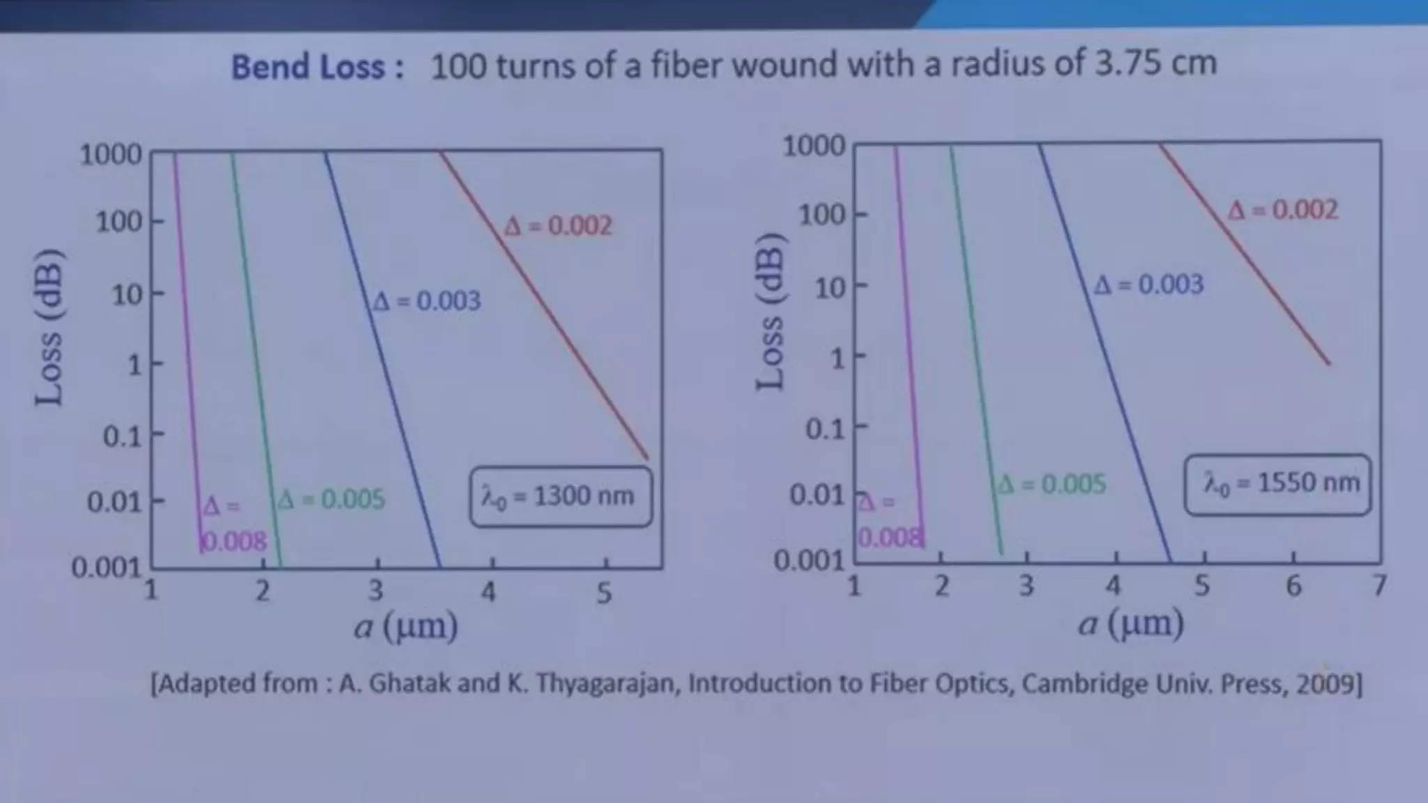 The document discusses two types of bending loss that can occur in optical fibers: macroscopic bending, which occurs when a fiber is bent with a radius larger than the core radius, and microbending, which is minimized by using a protective jacket around the fiber. It also mentions several factors that contribute to bending loss, such as the attenuation constant, radius of curvature, number of guided modes, and core and cladding properties between step index and graded index fibers that determine the loss experienced by each mode.
