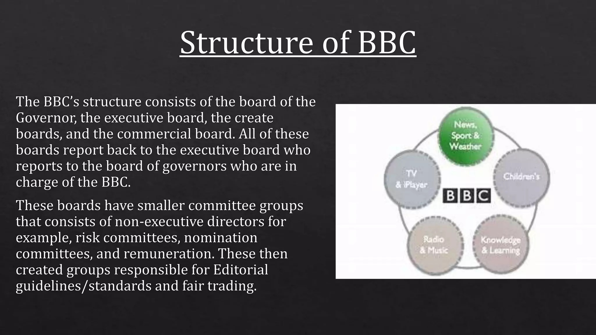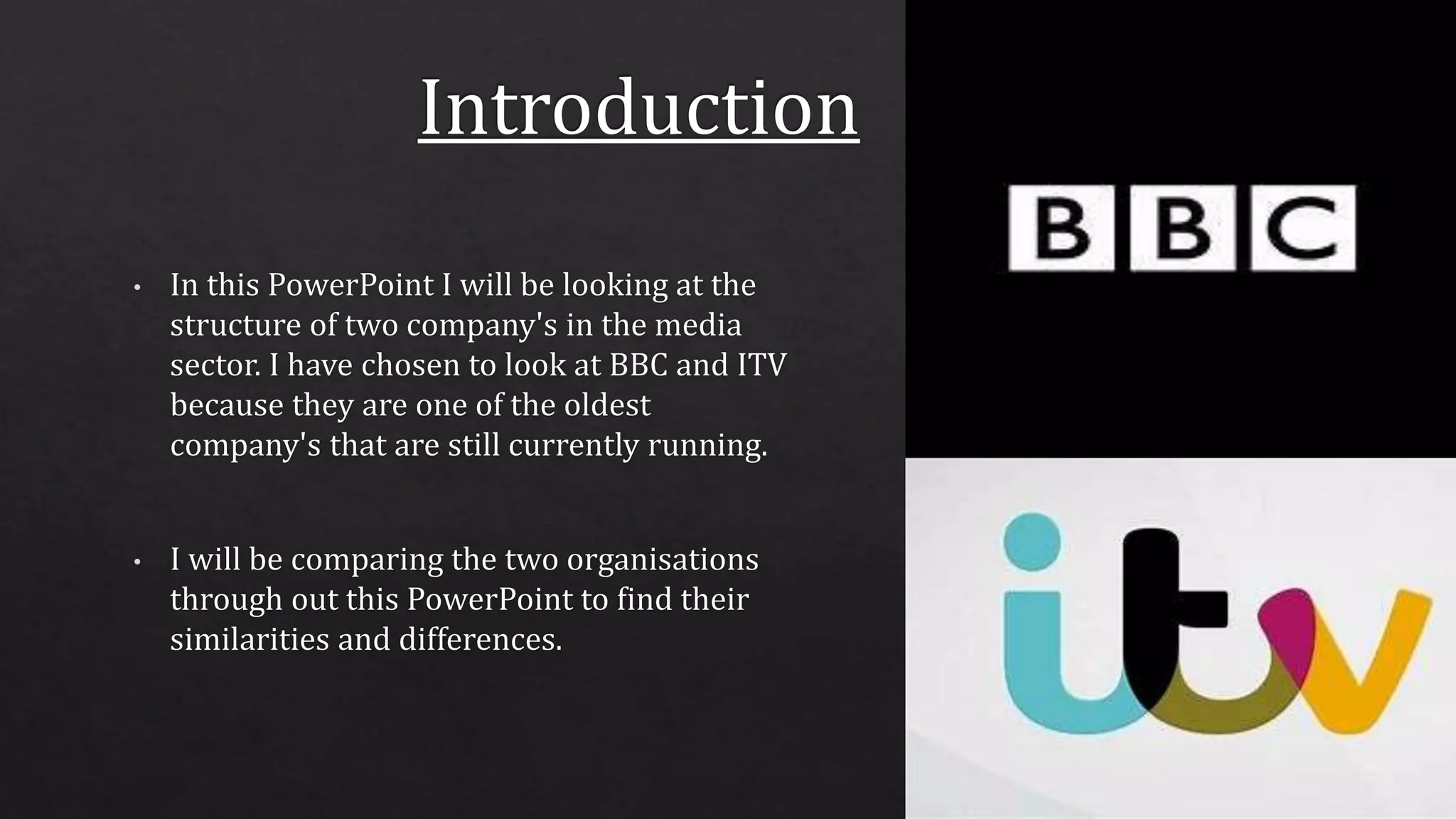 ITV is structured through various job categories including broadcast operations, communication, finance, and global entertainment. A group of directors are responsible for overseeing the company and making major decisions regarding budgets, finances, and performance. Finance plays a key role in ITV's structure by controlling pensions, taxes, and financial issues, which is essential for the company's profitability. Similarly, the BBC is publicly funded through television license fees and selling some of its channels and programs. Both ITV and the BBC produce a variety of television content across different genres but make money in different ways, with ITV relying more on advertising revenue and the BBC depending more on public funds.