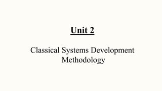 This document discusses classical systems development methodology. It describes the classical systems development life cycle (SDLC) which includes 7 phases: preliminary investigation, determination of system requirements, design of system, development of software, system testing, implementation and evaluation, and system maintenance. It also discusses tools and techniques used in each phase like fact finding techniques, documentation tools, and decision models.