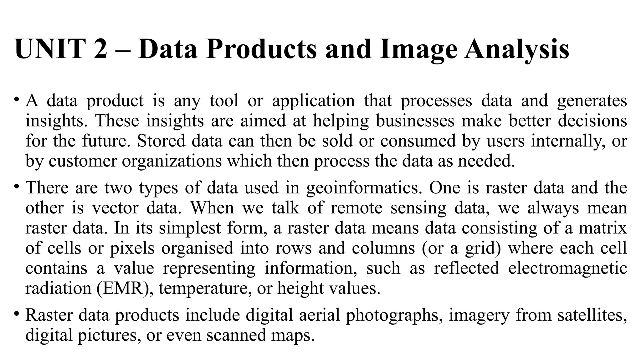 The document discusses data products and image analysis in geoinformatics, specifically focusing on remote sensing data types - raster and vector. It outlines various categories of data products based on processing levels, output media, and area coverage, emphasizing the importance of georeferencing and providing examples of standard, value-added, and derived products. Additionally, it covers image interpretation techniques, the significance of scale in maps, and how remote sensing data is utilized for insightful analysis.