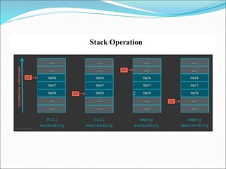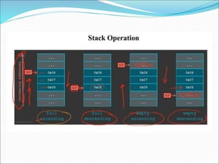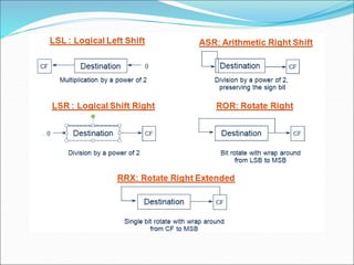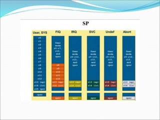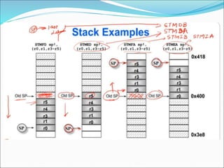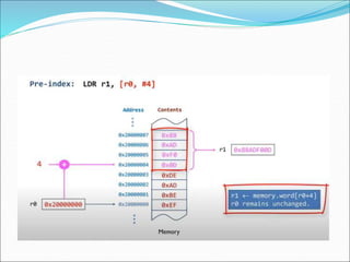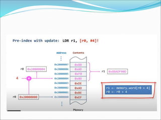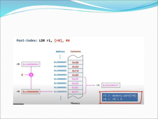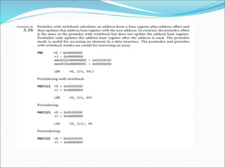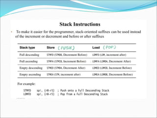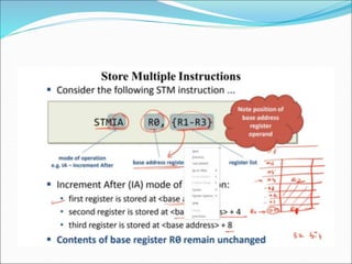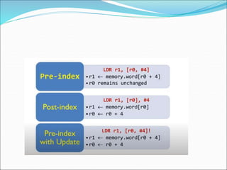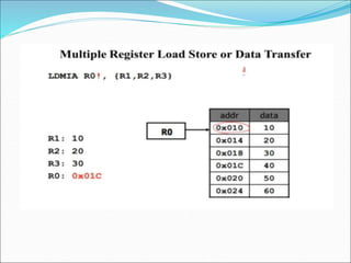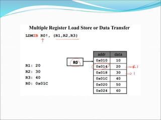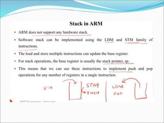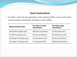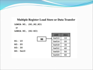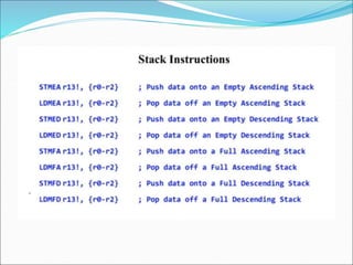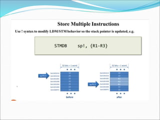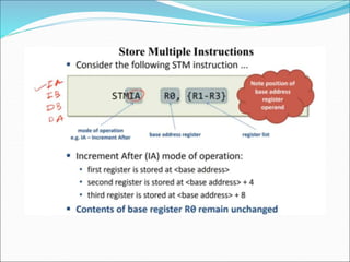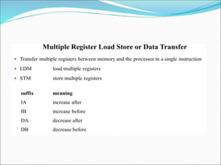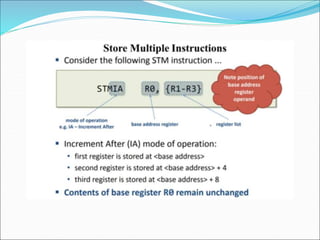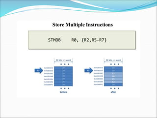 This document provides an overview of the ARM instruction set, which can be categorized into three groups: data processing instructions, data transfer instructions, and control flow instructions. It describes the various data processing instructions like move, arithmetic, logical, comparison, and multiply instructions. It also covers the different addressing modes for load/store single and multiple register instructions. Branch instructions and other instructions for program flow control are also outlined.