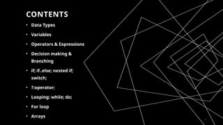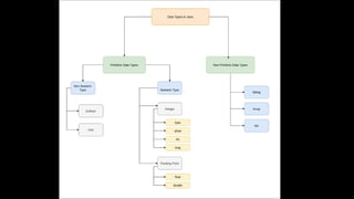 The document provides an overview of Java programming concepts including data types, variables, and key structural components such as operators, control statements, and loops. It explains Java tokens, example codes for various programming constructs, and describes the usage of primitive and non-primitive data types. Additionally, it covers type casting, operators, and emphasizes decision-making structures in Java programming.