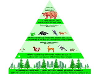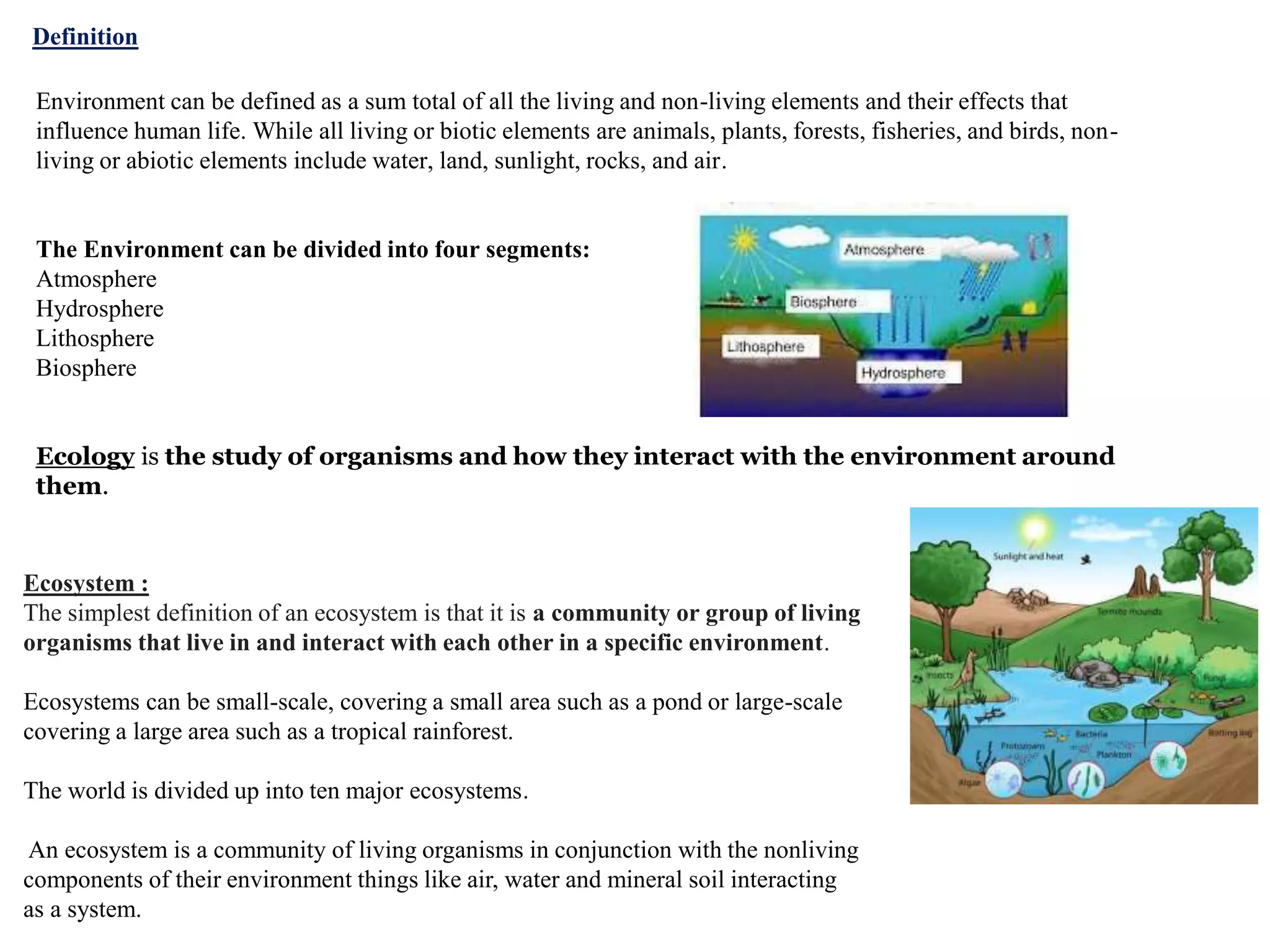 The document defines environment and its components, including biotic elements like plants and animals and abiotic elements like air and water. It then discusses key concepts like ecosystems, which are communities of interacting living and non-living things in an environment. Ecosystems have biotic components like producers, consumers, and decomposers, as well as abiotic factors like temperature, water, and nutrients. Energy and matter flow through food chains and webs in ecosystems. Common ecosystems like forests, grasslands, deserts, ponds, and oceans are also outlined.