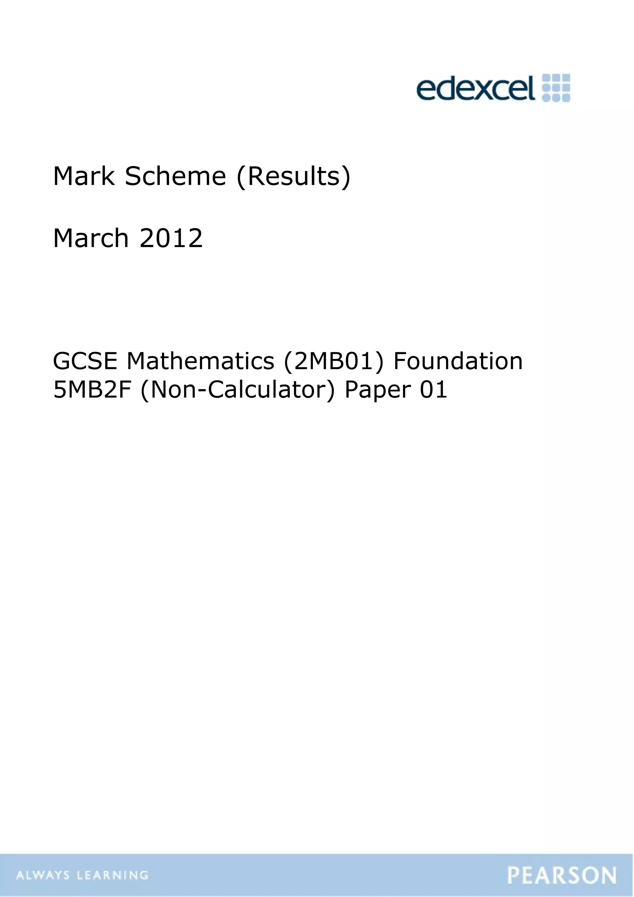 The document is a mark scheme for GCSE Mathematics (2MB01) Foundation 5MB2F (Non-Calculator) Paper 01 exam from March 2012. It provides notes on marking principles and guidance for how to apply marks for specific types of questions and responses. It also includes worked examples showing the breakdown of method and accuracy marks for sample multi-step questions.