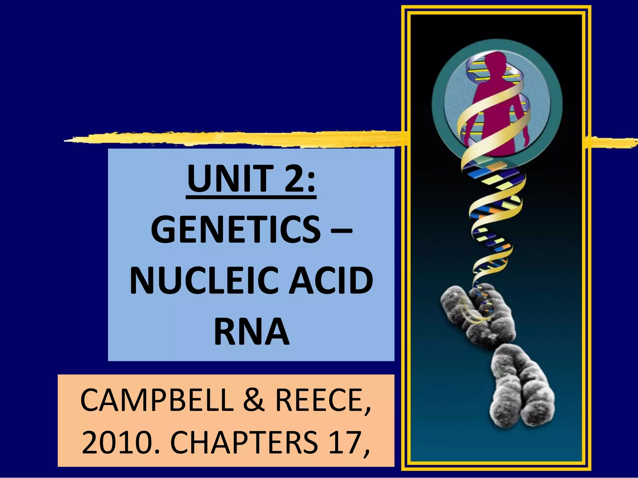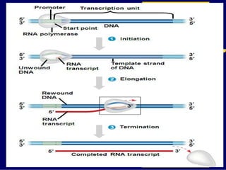 RNA is a single-stranded nucleic acid that plays several roles in protein synthesis. It has a ribose sugar backbone instead of deoxyribose and contains the nitrogenous base uracil instead of thymine. There are several types of RNA, including mRNA, tRNA, and rRNA. mRNA carries the genetic code from DNA in the nucleus to the ribosomes in the cytoplasm. tRNA transfers amino acids to the ribosome during protein synthesis. rRNA makes up part of the ribosome and helps bind mRNA and proteins together. Protein synthesis involves two main stages - transcription of DNA to mRNA in the nucleus, and translation of mRNA to protein by ribosomes in the cytoplasm.