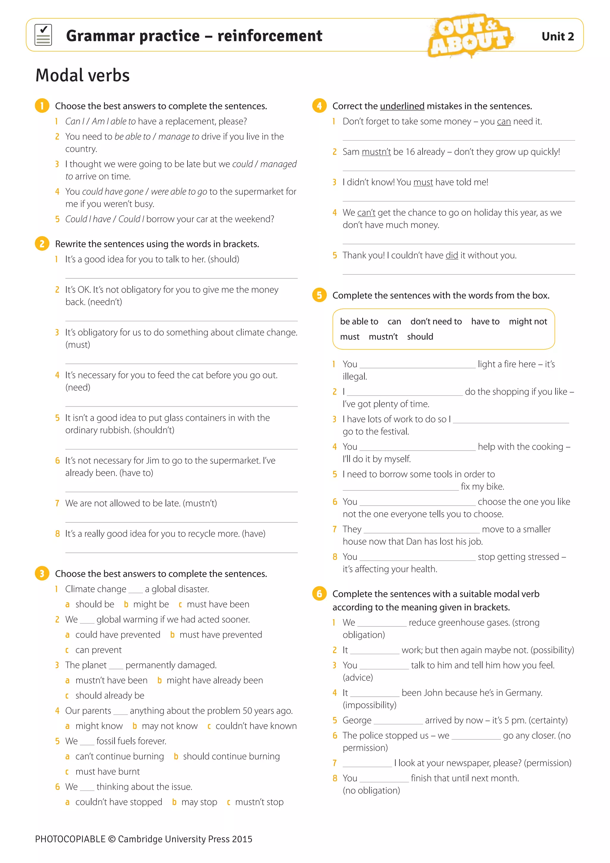 This document provides a grammar exercise on modal verbs. It contains 6 sections: 1) choosing modal verbs to complete sentences, 2) rewriting sentences using modal verbs in brackets, 3) choosing modal verbs to complete sentences about climate change, 4) correcting underlined mistakes in sentences using modal verbs, 5) completing sentences with modal verbs from a word bank, and 6) completing sentences with suitable modal verbs according to the given meaning. The document tests understanding and use of modal verbs such as can, could, may, might, must, should, need to, have to, etc. in different syntactic contexts.
